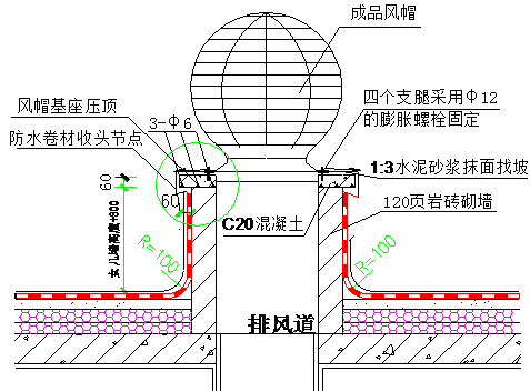 风帽基座压顶下防水卷材的收头按《屋面88J5-1》第28页的节点1做法,如图20所示。